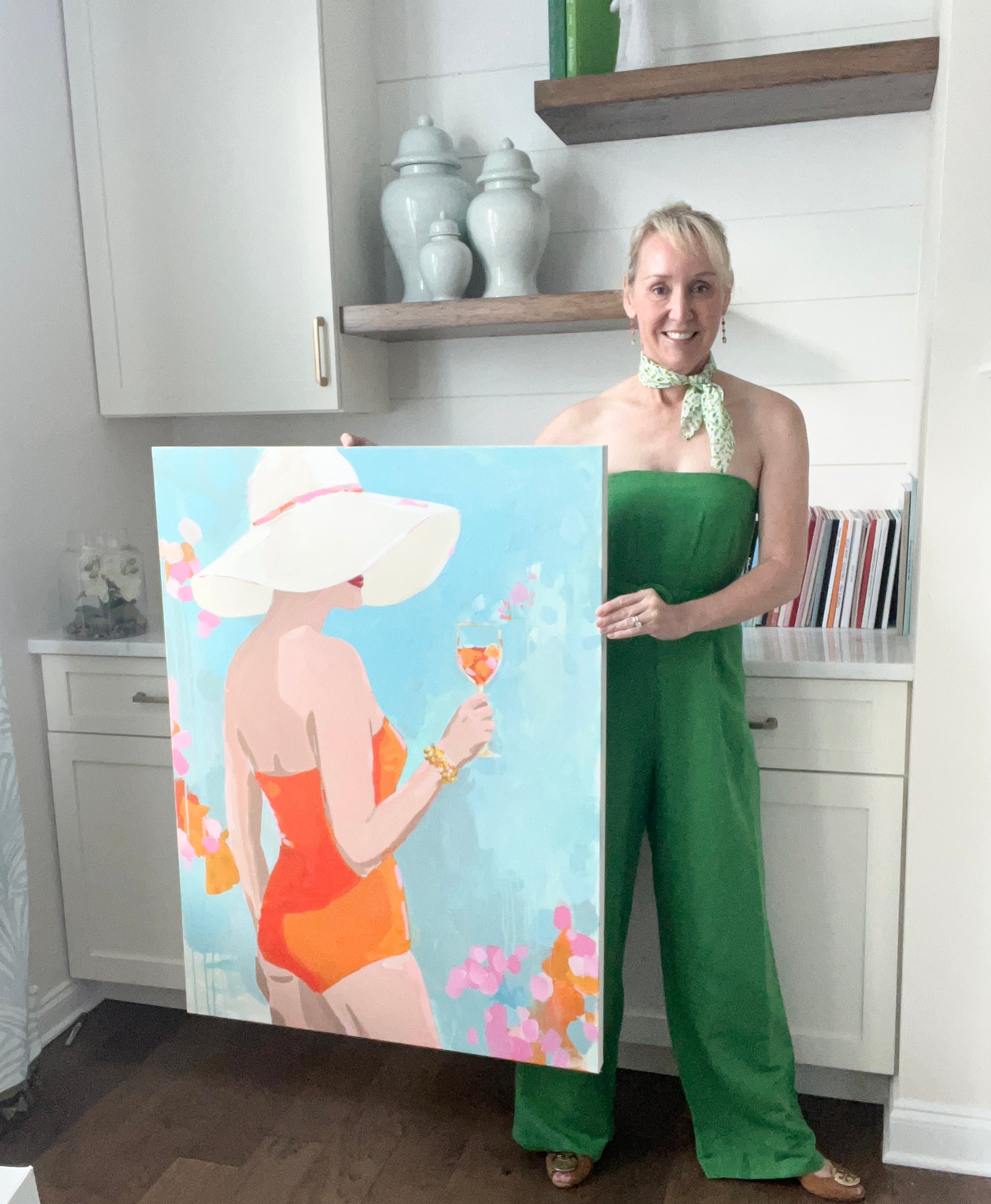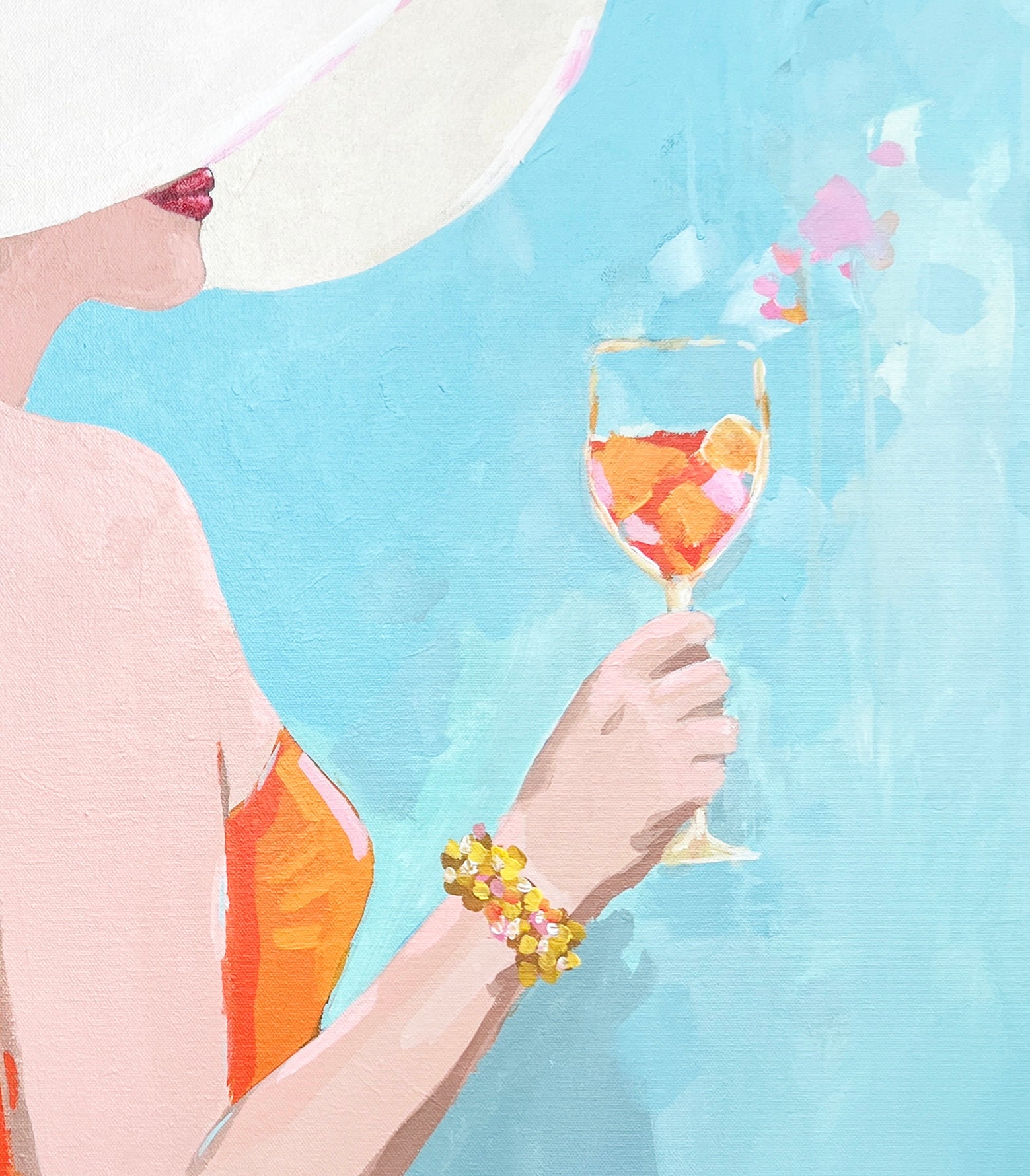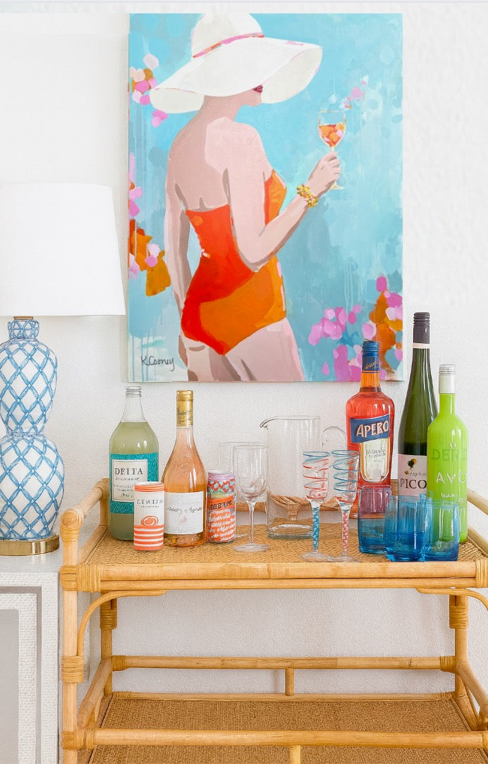 Ali was always the life of the poolside - chic, sparkling, and never without a cocktail. She made jaws drop when she finally donned her new one-piece that coordinated perfectly with her signature spritz.