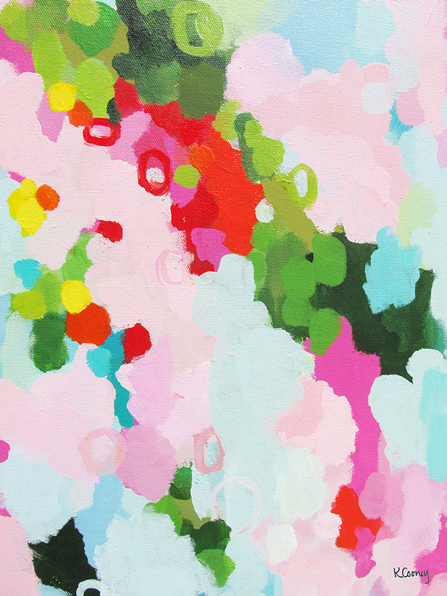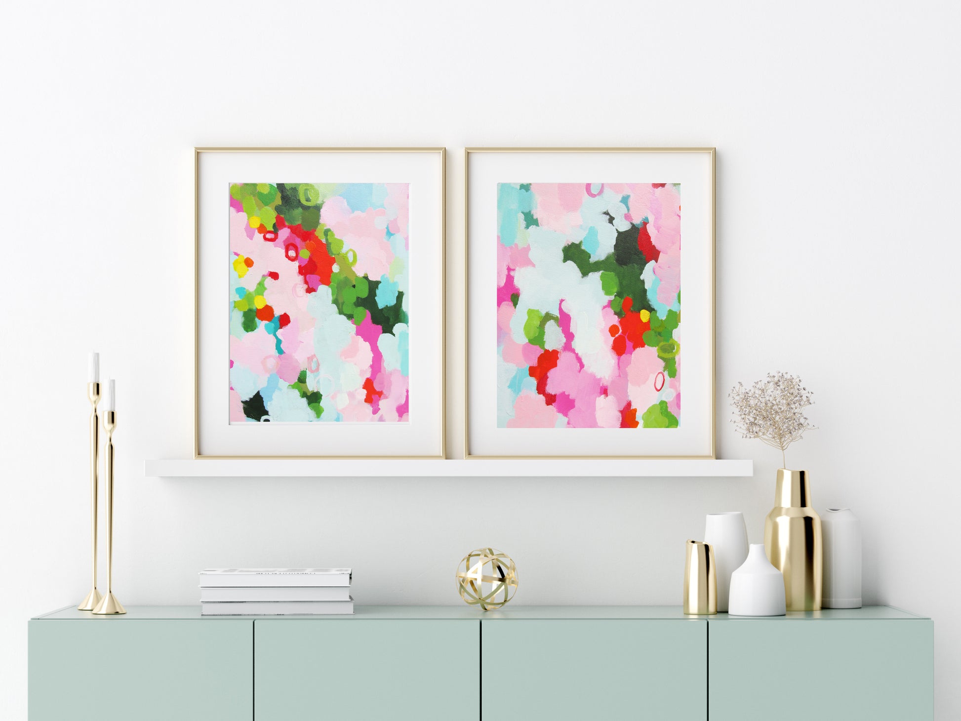 Variations of pink, green, and blue will brighten any room. Small pops of red and orange add even more interest. This piece is part of a collection of 3, all of which can be mixed and matched beautifully on a gallery wall. They have hung in bedrooms, nurseries, and powder rooms as true statement pieces. Wouldn't they look great in a gallery wall with landscapes and figures as well?