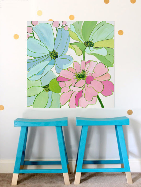 The beauty of a botanical garden and with the happiness of color unite to make each piece in the FLORA SERIES a source of joy for any room. This series was inspired by the blooms surrounding my home in springtime and my obsession with midcentury wallpaper patterns. These large scale florals are a perfect focal point in a foyer vignette or gorgeous accent to any special spot in your home.