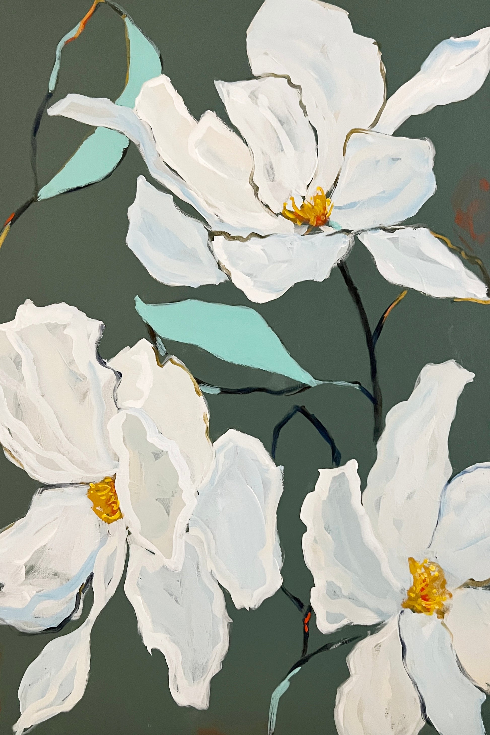For this floral piece, I wanted to go neutral with the elegant cream flowers, but make it POP with a bold background. This stunning background color has hints of green, blue, and a warm gray...planned to work perfectly with any room's palette.