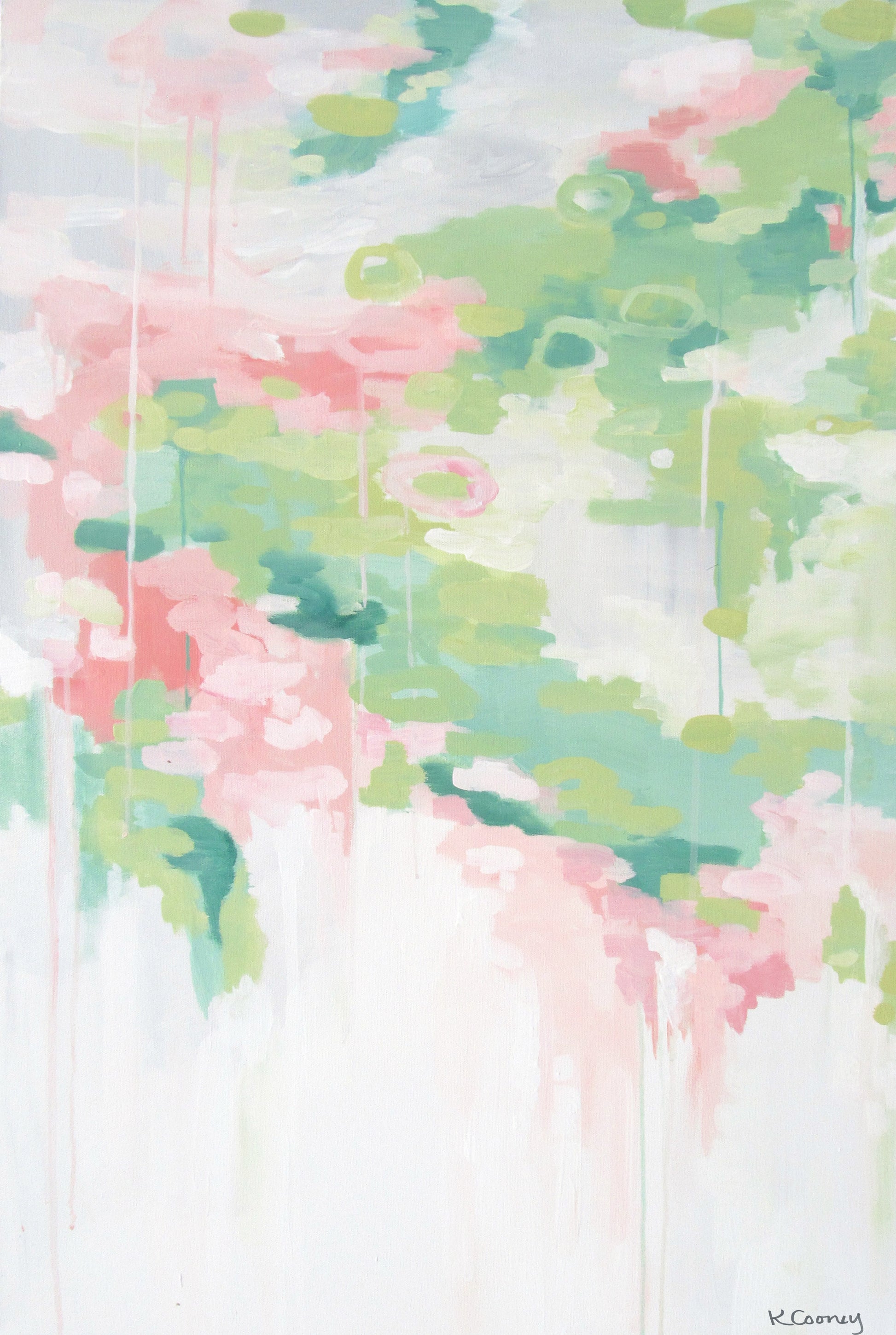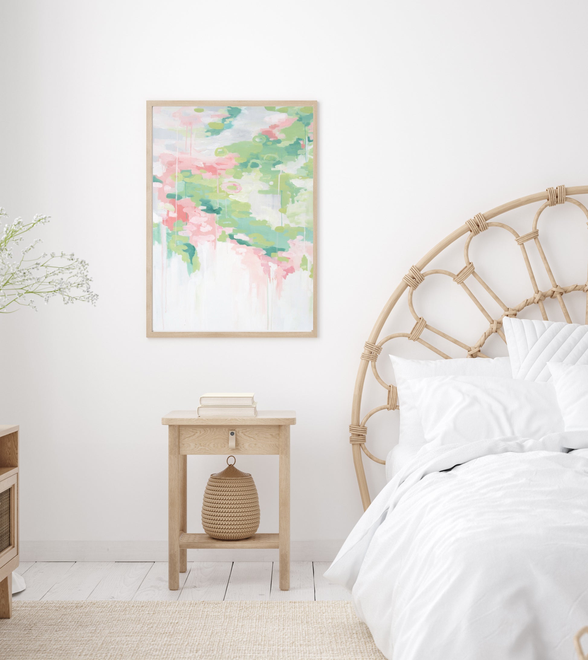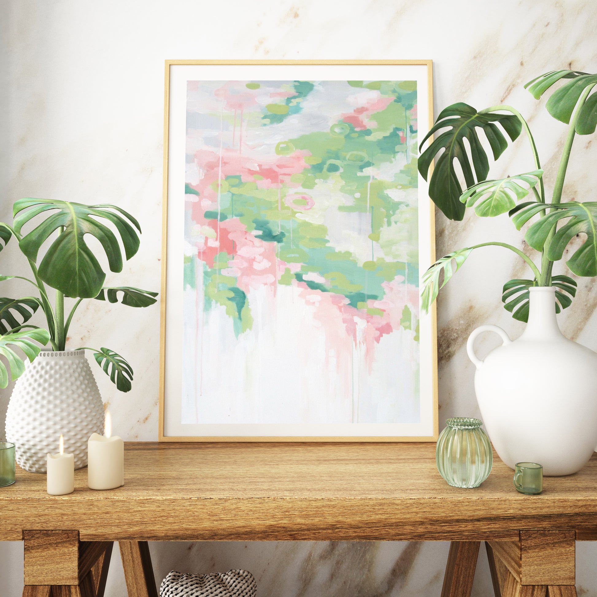 Peachy pinks with light greens give a sense of floral reflections on the surface of water. The white negative space encourages a sense of lightness and calm.