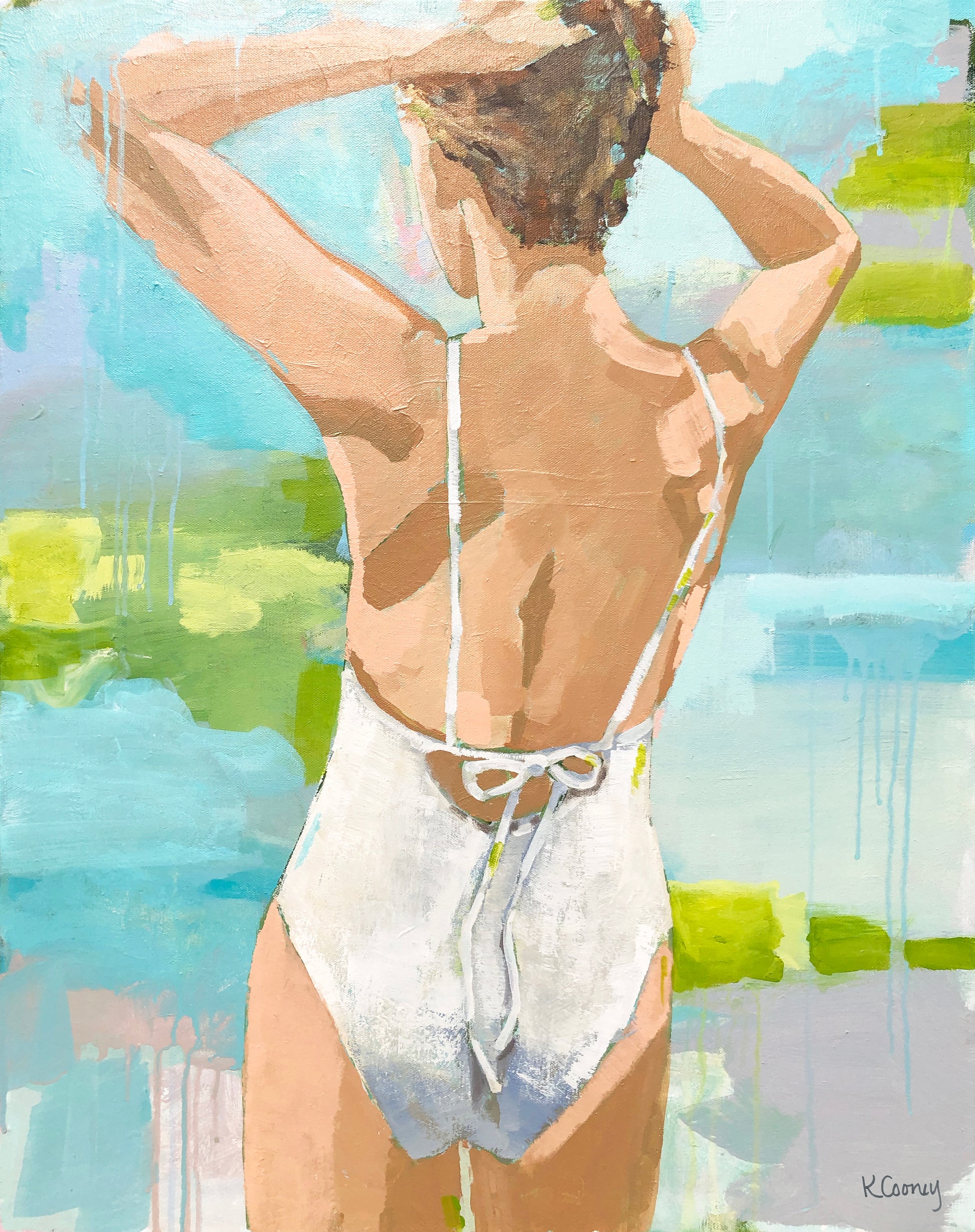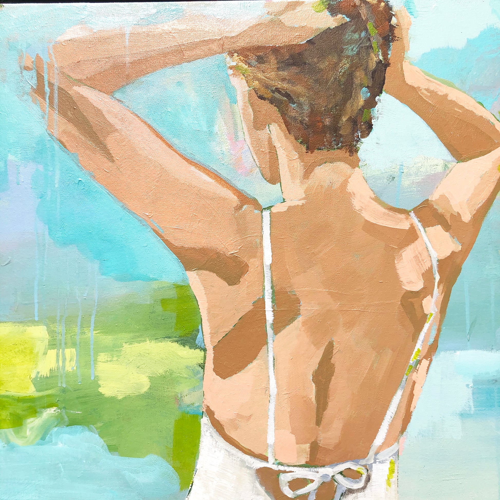 Lots of texture and drips make this piece a true original. A palette knife was used on the cream colored swimsuit to add depth and shadow to the loosely tied bow.