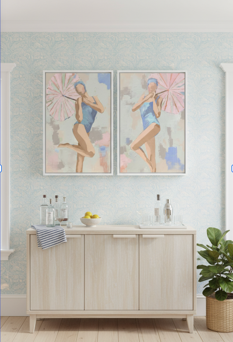 POOLSIDE PARASOL 1 and her coordinating piece, POOLSIDE PARASOL 2 are ready to brighten your decor. With a nostalgic nod to femininity and a palm beach vibe, this piece will definitely add some fun and elegance to your home.