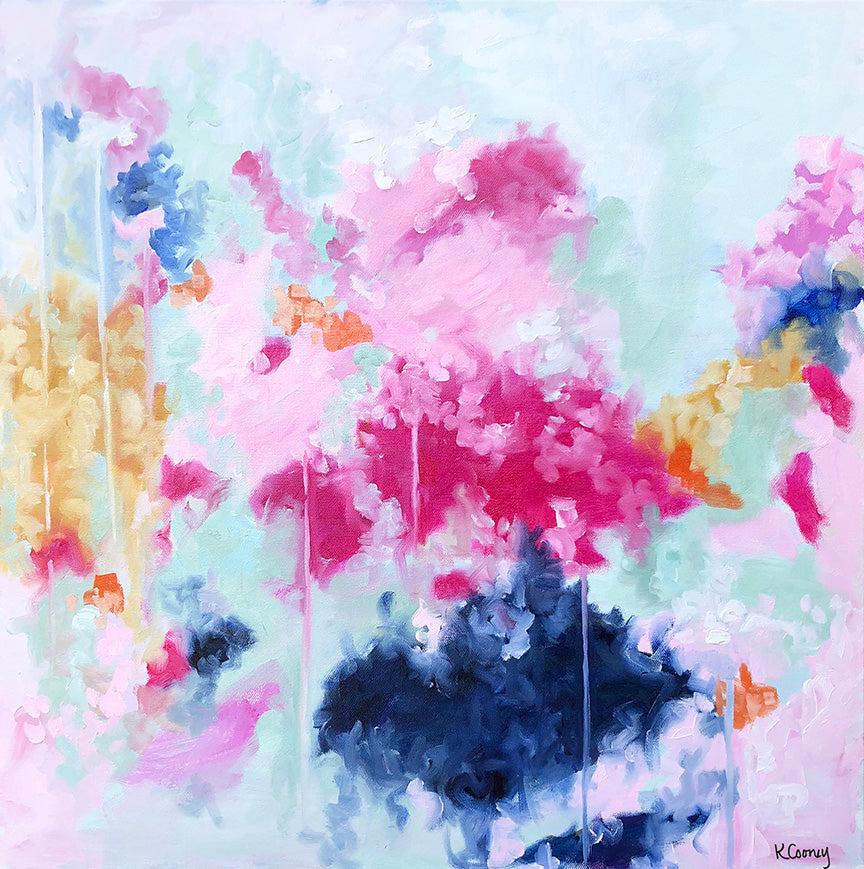 Pinks, blues, and a touch of orange make this piece a great accent for any room or backdrop for the perfect vignette. Place it above your bar and you’re ready for a fantastic party! For an even more professional look, pair this piece with her sister piece, PRETTY PERSUASION